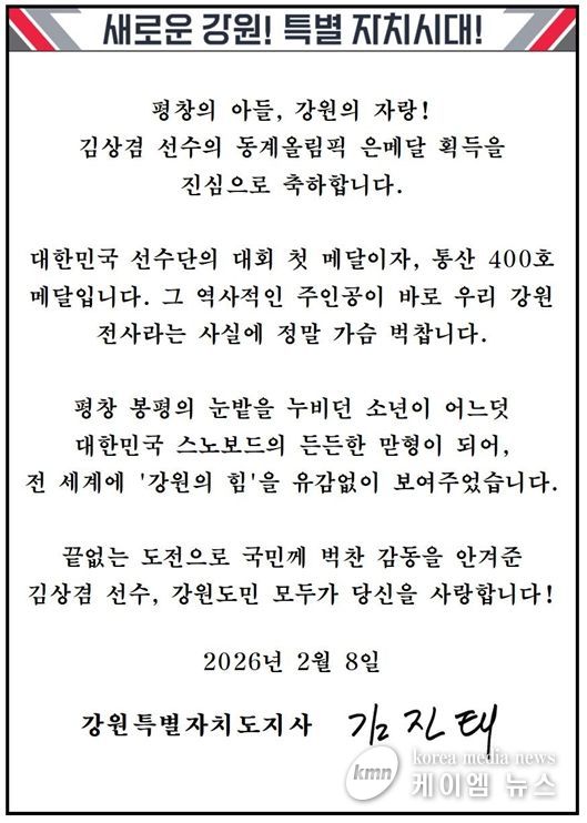 (케이엠뉴스) 김진태 도지사는 8일 2026 밀라노-코르티나담페초 동계올림픽대회에서 강원특별자치도(하이원 스포츠단) 소속 김상겸 선수의 남자 스노보드 평행대회전 은메달 획득을 축하하며, 축전을 보냈다.
