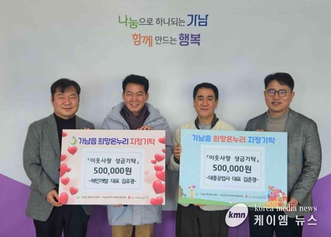 (케이엠뉴스) 여주시 가남읍 행정복지센터는 지난 9일, 해인개발과 대흥공업사에서 관내 어려운 이웃을 위한 성금 각 50만 원을 기탁하고, ‘가남읍 희망온누리’ 정기기부에 신규 참여했다고 밝혔다.