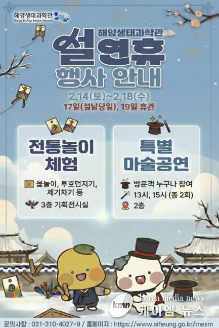 (케이엠뉴스) 시흥시는 설 명절을 맞아 시민과 방문객이 뜻깊은 시간을 보낼 수 있도록 오는 2월 14일부터 18일까지 해양생태과학관에서 설 연휴 특별 행사를 운영한다.