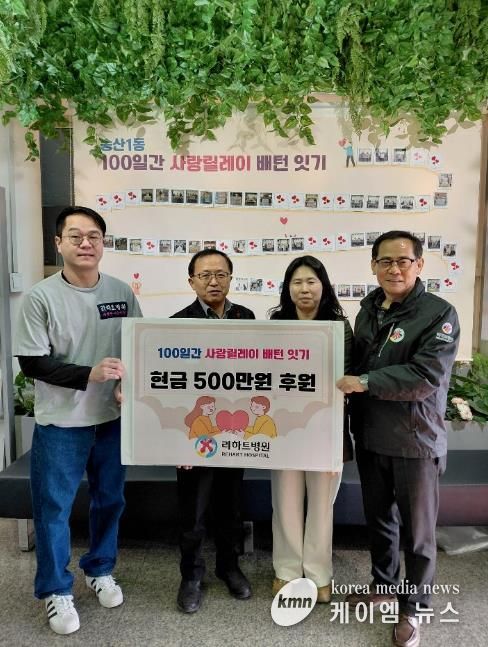 (케이엠뉴스) 의정부시 송산1동주민센터는 2월 9일 용현동 소재 리하트병원이 ‘100일간 사랑릴레이 배턴 잇기’에 동참해 성금 500만 원을 기탁했다고 밝혔다.
