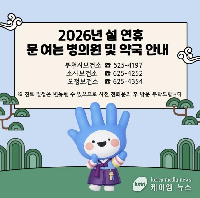 송정원 부천시보건소장은 “시민들이 안심하고 건강한 설 연휴를 보낼 수 있도록 의료 공백이 발생하지 않게 현장 대응과 관리에 힘쓰겠다”며 “응급 상황에도 신속히 대응할 수 있도록 관련 기관과의 협력을 이어가겠다”고 말했다.