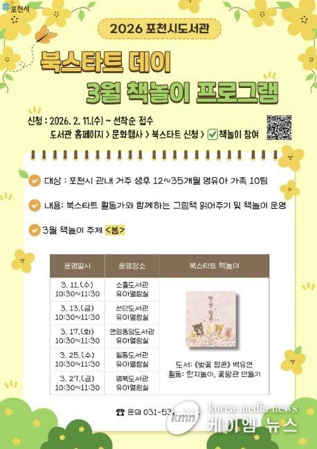 이와 함께 포천시는 오는 3월부터 ‘북스타트 데이’ 책놀이 프로그램도 운영한다. 해당 프로그램은 포천시 도서관 5개소(면암중앙·소흘·일동·영북·선단)에서 관내 12~35개월 영유아를 대상으로 진행된다. 북스타트 활동가와 함께 주제별 그림책 읽기와 연계한 책놀이 활동을 통해 영유아의 정서 발달과 부모·자녀 간 교감을 돕는다.