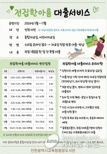 (케이엠뉴스) 인천광역시교육청중앙도서관은 지역주민에게 다양한 독서 기회를 제공하기 위하여, 3월부터 11월까지 ‘전집한아름 대출서비스’를 운영한다.