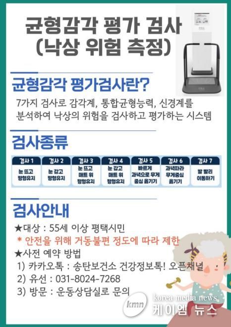 (케이엠뉴스) 평택시 송탄보건소는 뵄여성 건강이음서비스’참여자를 대상으로 균형감각 측정을 통해 낙상 위험도를 평가한다고 밝혔다.