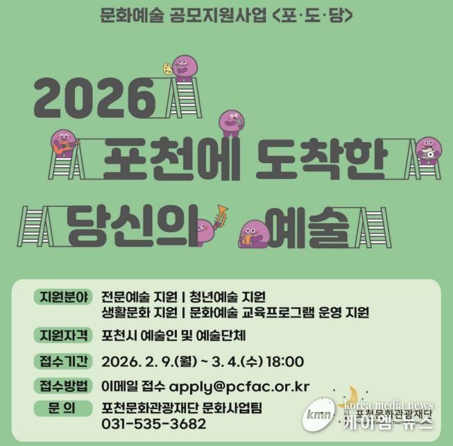 (케이엠뉴스) 포천문화관광재단은 2026년 문화예술 공모지원사업 ‘포천에 도착한 당신의 예술’(이하 ‘포도당’)에 참여할 예술인과 예술단체를 대상으로 공모를 진행한다.