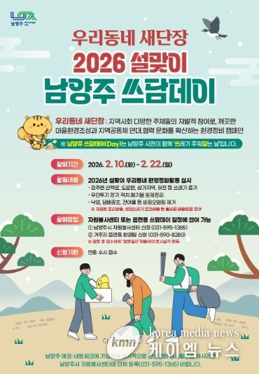 (케이엠뉴스) 남양주시는 10일부터 22일까지 시 전역에서 ‘설맞이 우리동네 새단장 남양주 쓰담데이 집중 추진기간’을 운영한다고 밝혔다.