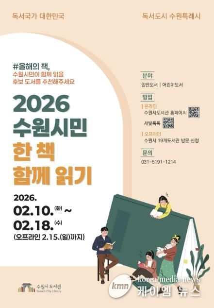 (케이엠뉴스) 수원시도서관이 ‘2026 수원시민 한 책 함께 읽기’ 올해의 책 후보 도서를 2월 18일까지 추천받는다. 수원시민 누구나 추천할 수 있다.