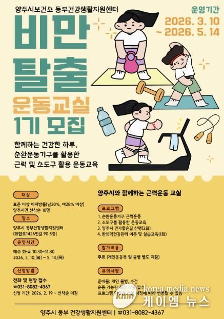 (케이엠뉴스) 양주시보건소 동부 건강생활지원센터에서 지역 주민의 만성질환 예방과 건강한 생활 습관 형성을 위해 순환운동기구를 활용한 근력운동 프로그램인 2026년도 ‘비만탈출 운동교실’ 1기 참여자를 모집한다.