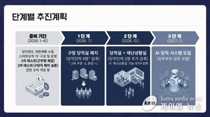 시는 올해 상반기를 사전 준비 기간으로 정하고, 8개 부서가 참여하는 AI 당직 전담조직(TF)을 구성하고 시·구청 당직 통합 시 근무량을 검증했다. 다음 달에는 구청 당직 폐지 시 예상되는 시민 불편과 사각지대를 시뮬레이션 방식으로 점검하고, 5월까지 조례·규칙 개정과 법제 심사를 마쳐 제도적 기반을 마련할 예정이다.