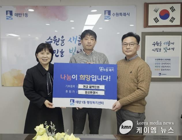(케이엠뉴스) 영통구 매탄1동은 지난 12일 명성환경(주)이 설명절을 맞이하여 어려운 이웃을 돕기 위해 현금 100만 원을 후원했다고 밝혔다.