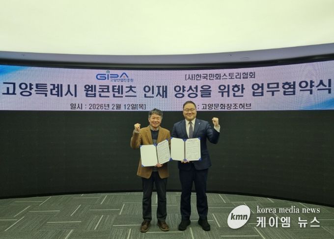 (케이엠뉴스) 고양산업진흥원이 지난 12일 고양문화창조허브에서 한국만화스토리협회와 웹툰·웹소설 분야 전문 인재 양성을 위한 업무협약을 체결했다.