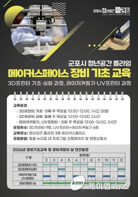 하은호 군포시장은 “이번 교육과 장비개방 프로그램을 통해 청년들이 메이커 장비를 보다 안전하고 실질적으로 활용할 수 있는 환경을 조성하고자 한다”며 “아이디어 구현부터 시제품 제작까지 이어지는 창작 활동의 기반이 되길 기대한다”고 전했다.