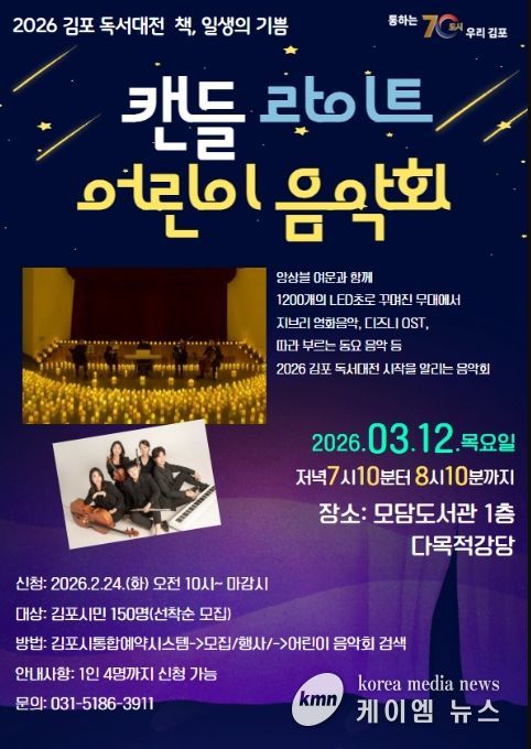 (케이엠뉴스) 김포시 도서관은 2026 김포 독서대전의 시작을 알리는 공연으로 '캔들 라이트 어린이 음악회'를 2026년 3월 12일 19시 10분부터 20시 10분까지 모담도서관 1층 다목적강당에서 진행한다.