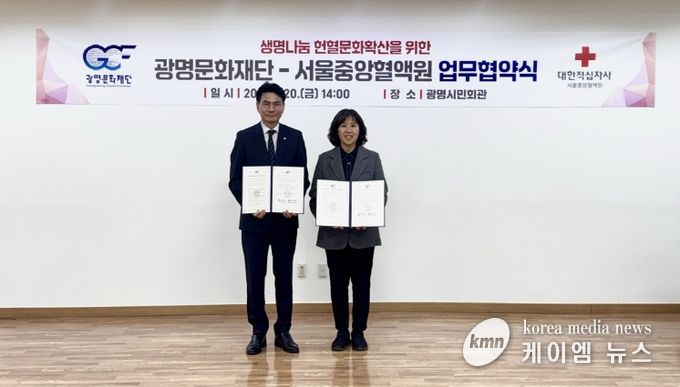 (케이엠뉴스) (재)광명문화재단(대표이사 송은영)은 서울중앙혈액원(원장 이재용)과 함께 2월 20일 오후 2시에 광명시민회관에서 '헌혈자 대상 문화예술 프로그램 제공 및 헌혈 문화 정착을 위한 업무협약'을 체결했다고 밝혔다.