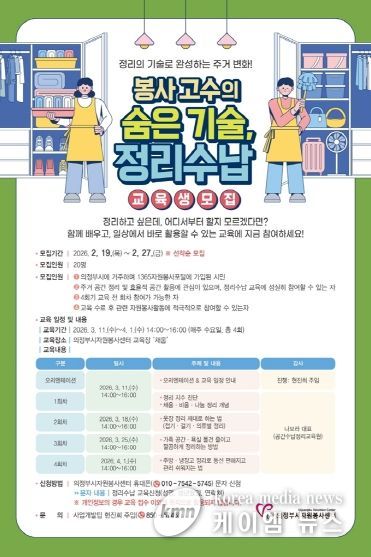 (케이엠뉴스) 의정부시자원봉사센터는 시민들의 주거환경 개선 역량 강화를 위해'봉사고수의 숨은 기술, 정리수납 교육'을 오는 3월 11일부터 4월 1일까지 매주 수요일 오후 2시부터 4시까지 총 4회에 걸쳐 진행하며, 이에 따른 참여자를 오는 2월 27일까지 모집한다.