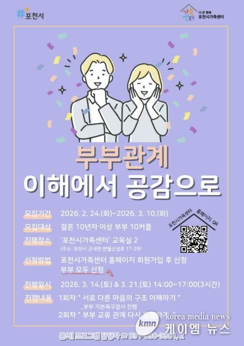 (케이엠뉴스) 포천시가 직영하는 더 큰 행복 포천시가족센터는 오는 24일부터 결혼 10년 이상 부부를 대상으로 한 관계 증진 프로그램 ‘부부 관계 이해에서 공감으로’ 참여자를 모집한다.