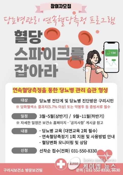 (케이엠뉴스) 구리시 보건소는 2월 23일부터 당뇨병관리 연속혈당측정 프로그램 '혈당 스파이크를 잡아라'의 참여자를 모집한다고 밝혔다.