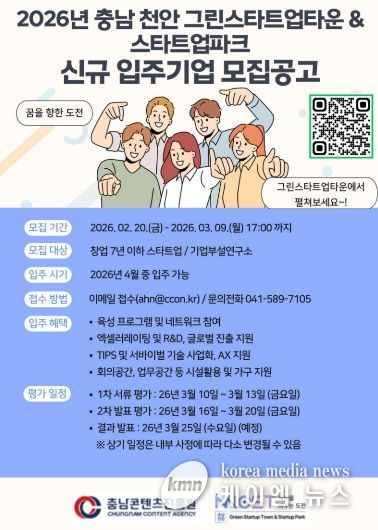 (케이엠뉴스) 충남콘텐츠진흥원은 오는 26년 3월 9일까지 ‘충남 천안 복합형 스타트업 파크’에 입주할 신규 스타트업을 모집한다고 밝혔다.