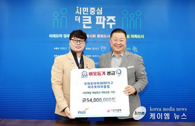 (케이엠뉴스) 파주시는 23일 ‘국제로타리 3690지구 파주로타리클럽’으로부터 60세 이상 취약계층을 위한 5,400만 원 상당의 대상포진 사백신을 지원받았다고 밝혔다.