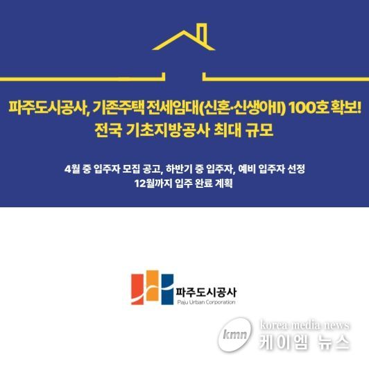 (케이엠뉴스) 파주도시공사는 지난 25일 ‘기존주택 전세임대(신혼·신생아Ⅱ유형)’ 사업 물량 100호에 대한 공급계획 승인신청서를 국토교통부에 제출했다고 밝혔다.