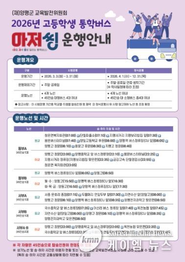 (케이엠뉴스) (재)양평군교육발전위원회는 원거리 학생들의 통학 불편을 해소하기 위해 기존 1개 지역 1대로 운영하던 통학버스를 올해 3월부터 6개 지역, 총 4대로 확대 운영한다고 밝혔다.