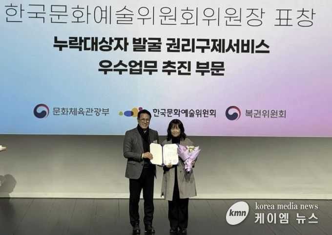 (케이엠뉴스) 군포시 수리동이 전국 3천6백여개 읍면동을 대상으로 한 “2025년 통합문화이용권(문화누리카드) 누락대상자 권리구제 서비스” 부문 우수기관으로 선정됐다. 이에 따라 지난 2월 26일 모두예술극장(서울 서대문구 충정로 7)에서 열린 시상식에서 한국문화예술위원회 위원장상을 수상했다.
