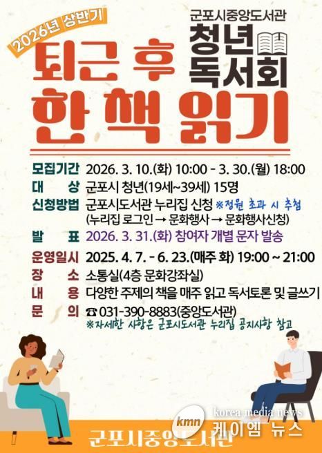(케이엠뉴스) 군포시중앙도서관은 군포시 청년들의 인문교양 증진과 독서문화 활성화를 위해 2026년 4월부터 상반기 청년독서회 '퇴근 후 한 책 읽기 : 소설을 읽다, 사람을 읽다'를 운영한다.