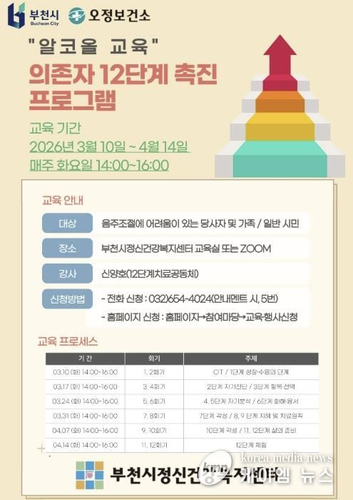(케이엠뉴스) 부천시는 부천시정신건강복지센터와 함께 음주 조절에 어려움을 겪는 시민의 회복을 지원하기 위해 3월 10일부터 4월 14일까지 매주 화요일 ‘의존자 12단계 촉진’을 주제로 알코올 교육을 진행한다.
