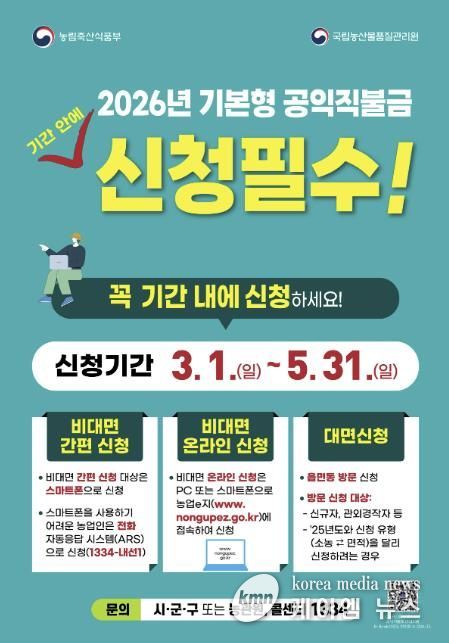 (케이엠뉴스) 홍성군은 3월 1일부터 5월 31일까지 농업인의 소득 안정을 돕고 농업·농촌의 공익기능 강화를 위한 2026년 기본형 공익직불금 신청을 접수한다.
