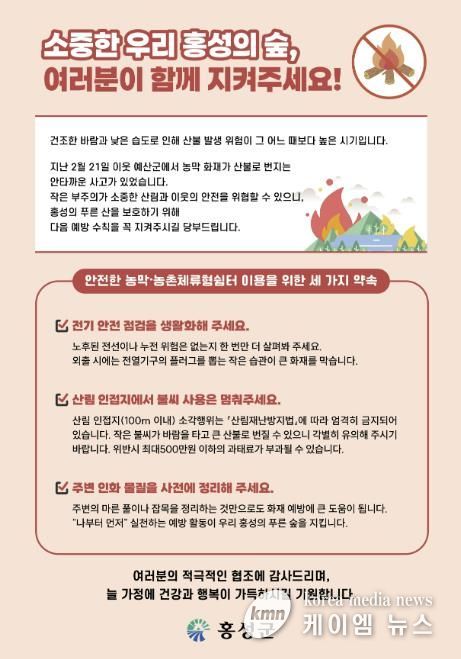 (케이엠뉴스) 홍성군은 산림 인접 지역 농막과 농촌체류형쉼터 이용 증가에 따라 화재 위험을 사전에 차단하기 위해 관련 소유자를 대상으로 산불예방 안내문을 배포하고, 군민 참여형 안전문화 확산에 나섰다. 이번 조치는 생활 속 실천 중심의 예방 활동을 통해 산불 위험을 낮추기 위한 선제적 대응이다.