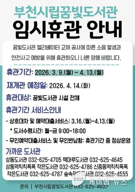 (케이엠뉴스) 부천시립꿈빛도서관은 노후 엘리베이터 전면 교체 공사를 위해 3월 9일부터 4월 13일까지 임시휴관한다. 공사 과정에서 분진과 소음 발생이 불가피한 만큼 이용자 안전을 확보하고 시민 불편을 최소화하기 위해 전면 휴관 후 공사를 진행한다.