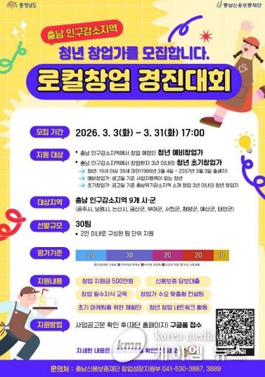 (케이엠뉴스) 충남도는 인구감소지역에 새로운 활력을 불어넣고 지속 가능한 지역 창업 생태계를 조성하기 위해 ‘충남 청년 로컬창업 경진대회’, ‘충남 로컬창업 청년멘토’ 모집을 추진한다고 5일 밝혔다.