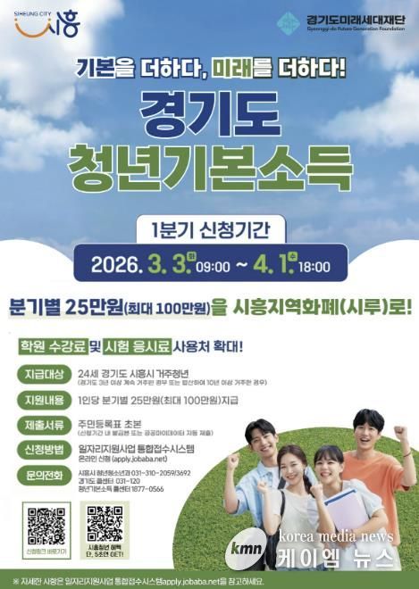 (케이엠뉴스) 시흥시는 청년의 사회적 기본권 보장과 지역경제 활성화를 위해 4월 1일까지 ‘2026년 1분기 청년기본소득’ 지급 신청을 받는다.