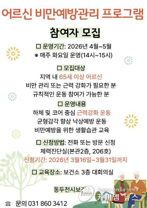 (케이엠뉴스) 동두천시 보건소는 오는 4월부터 어르신의 비만 예방과 근력 강화를 통한 낙상사고 예방을 위해 ‘어르신 비만예방관리 사업’을 추진한다.
