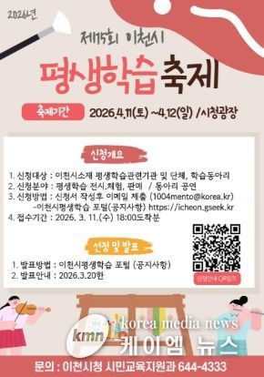 부스 및 공연 참가 신청은 3월 11일까지 접수하며, 신청서 양식은 이천시 평생학습 포털 내 소식정보(공지사항)에서 내려받을 수 있다. 심사 결과는 평생학습실무추진위원회 심사를 거쳐 3월 중 발표될 예정이다.