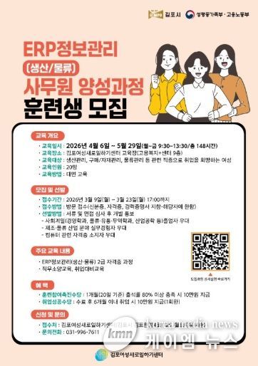 (케이엠뉴스) 김포여성새로일하기센터는 지역 산업 수요에 부합하는 전문 인력 양성과 경력보유 여성의 안정적인 취업 지원을 위해 '전사적 자원관리(ERP) 생산·물류 사무원 양성 과정' 훈련생을 모집한다.