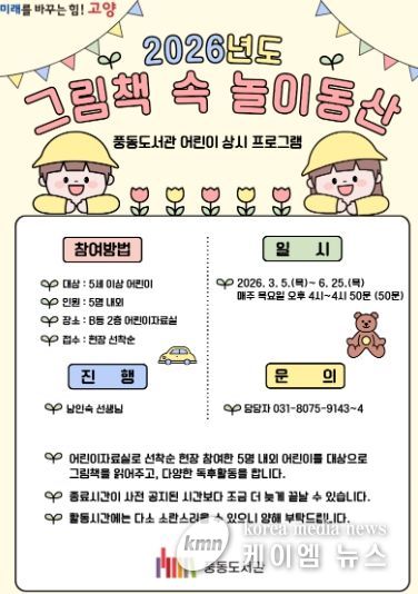 (케이엠뉴스) 고양특례시 풍동도서관은 어린이 그림책 읽어주기 상시 프로그램 ‘그림책 속 놀이동산’을 운영한다고 5일 밝혔다.