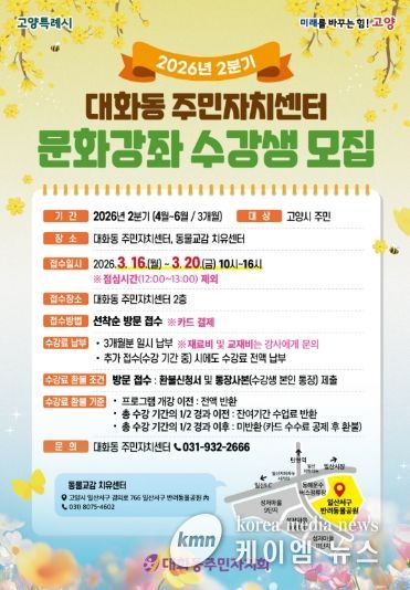 (케이엠뉴스) 고양특례시 일산서구 대화동 주민자치회는 주민들의 문화적 욕구를 충족하고 삶의 질을 높이기 위해 오는 3월 16일부터 20일까지 ‘2026년 2분기 문화강좌’ 수강생을 모집한다.