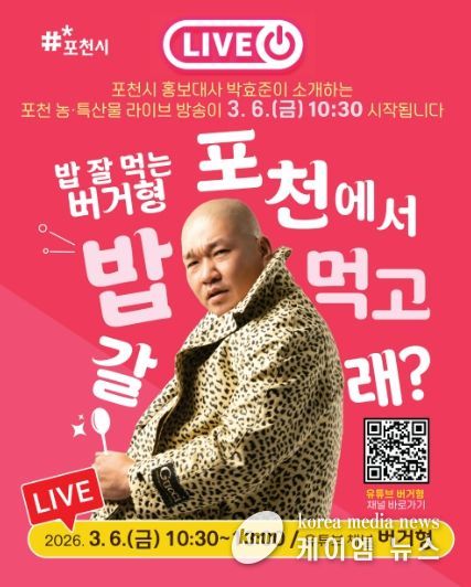 이번 방송은 오는 3월 6일 오전 10시 30분부터 유튜브 채널 ‘버거형’을 통해 실시간으로 진행되며, 포천의 우수한 농·특산물을 널리 알리고 소비자와의 소통을 강화하기 위해 마련됐다.