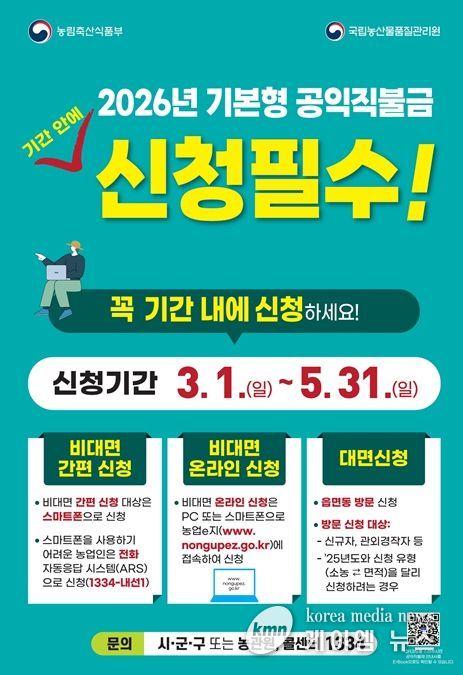 (케이엠뉴스) 강원특별자치도는 2026년 기본형 공익직불금 신청을 3월 1일부터 5월 31일까지 3개월간 접수한다고 밝혔다.