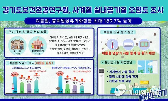 (케이엠뉴스) 경기도보건환경연구원이 도서관과 지역아동센터의 사계절 실내 공기질을 조사한 결과, 여름철에 이산화탄소(CO₂)와 총휘발성유기화합물(TVOC)농도가 가장 높은 것으로 나타났다.