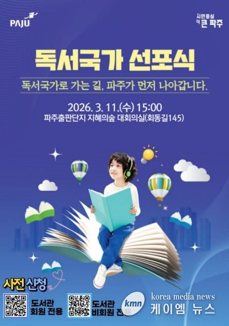(케이엠뉴스) 파주시는 오는 11일 15시, 파주출판도시 지혜의숲 대회의실에서 ‘파주시 독서국가 선포식’을 개최하고 책 읽는 도시를 넘어 ‘독서국가’로 나아가기 위한 힘찬 출발을 알린다.