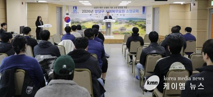 (케이엠뉴스) 수원시 팔달구는 지난 5일 팔달구청 대회의실에서 사회복무요원 전원을 대상으로 2026년 상반기 소양교육을 실시했다.