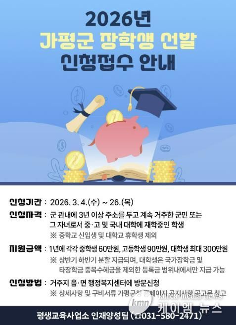 (케이엠뉴스) 가평군이 지역 학생들의 균등한 교육 기회를 보장하고 우수 인재를 육성하기 위해 2026년도 장학생 선발에 나선다.