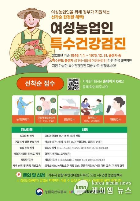 오산시 관계자는 “여성농업인은 농작업과 가사노동을 병행하면서 건강관리에 어려움을 겪는 경우가 많다”며 “이번 특수건강검진 지원사업을 통해 농작업으로 인한 질환을 조기에 발견하고 여성농업인의 건강한 농업활동을 지원하겠다”고 말했다.