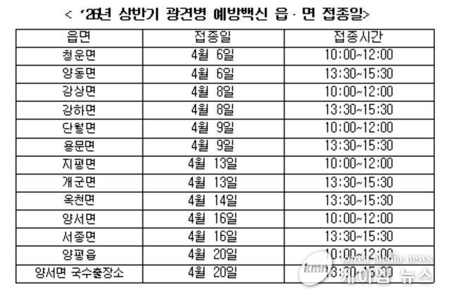 (케이엠뉴스) 양평군은 오는 4월 6일부터 4월 24일까지 광견병 예방접종을 실시한다고 밝혔다.