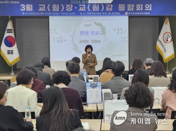 (케이엠뉴스) 경기도광명교육지원청은 3월 5일, 광명교육지원청 3층 해오름실에서 2026 해오름 광명교육과 경기미래교육 구현을 위한 ‘2026년 3월 교(원)장, 교(원)감 통합회의’를 운영했다. 이번 통합회의는 학년 초 학교와 교육지원청, 도교육청 간의 협력을 강화하고, 학교 중심의 교육정책, 미래장학, 교육과정운영의 선순환 체제를 통해 학교 중심 행정 지원의 기틀을 마련하고자 진행됐다.