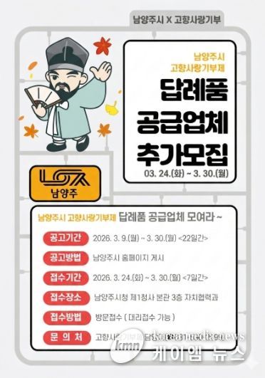 (케이엠뉴스) 남양주시는 오는 3월 24일부터 고향사랑기부제 참여자들에게 제공할 ‘2026년 고향사랑기부제 답례품 공급업체’ 추가 모집 접수를 시작한다고 6일 밝혔다.