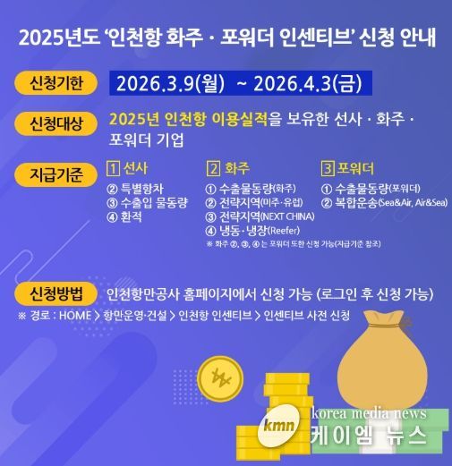(케이엠뉴스) 인천항만공사는 지난해 인천항을 이용한 화주와 포워더 기업을 대상으로 이달 9일부터 내달 3일까지 ’25년 인천항 선사·화주·포워더 인센티브’ 지급 신청을 받는다고 9일 밝혔다.