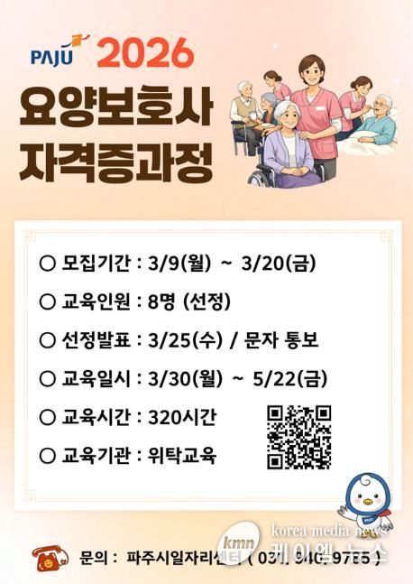 (케이엠뉴스) 파주시는 지역 내 구직자의 취업 역량 강화를 위해 ‘요양보호사 자격증 과정’참여자 8명을 모집한다.